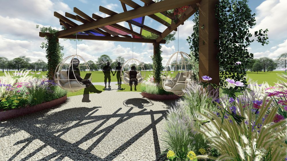 Metu konkursa pieteikuma darbs ar devīzi ‘BŪT ŠEIT “18’ veidots kā vieta, kur satikties, pabūt pie dabas, augiem vai naktī vērties zvaigžņotajās debesīs. Tā ir vieta, kur ieelpot svaigu gaisu pusdienu pārtraukumā, atvilkt elpu pēc garās dienas skolā vai vienkārši aptaustīt augus, paklausīties to čaboņā un pavērot kā starp ziediem dzīvo bites. Šīs dārzs ir vieta, kur pasēdēt vienatnē vai tikpat labi draugu lokā, vieta, kur būt, lai satiktos un izbaudītu neliela dārza burvību tepat Jelgavā.
